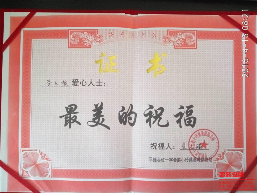 2016年山西超躍安防董事長李立根先生參加平遙縣紅十字會趙曉玲慈善救助,而被救助人回饋給李董事長愛心人士證書,大愛在人間。讓我們對愛心人士點個贊?。?!